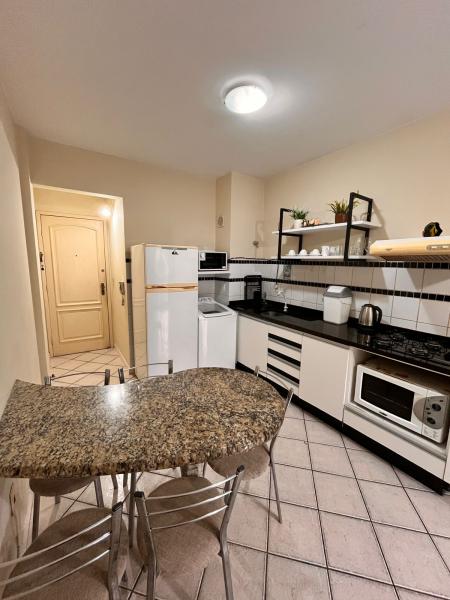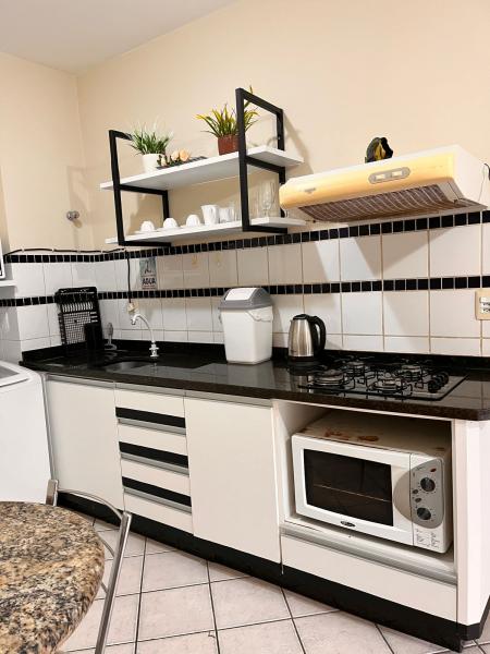 Apartamento mobiliado com sala de estar, jantar e cozinha integradas, um quarto, um banheiro e sacada com churrasqueira.